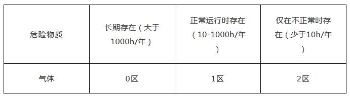 按場所中危險物質存在時間的長短,將兩類不同物態下的危險場所劃分為三個區,即:對爆炸性氣體環境,為 0 區、 1 區和 2 區;對可燃性粉塵環境,為 20 區、 21 區和 22 區。