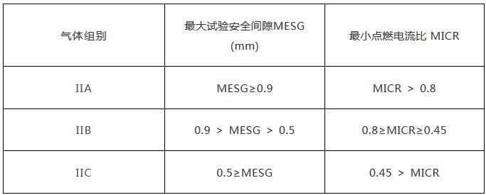 II 類隔爆型電氣設備或本質安全型電氣設備,按其適用于爆炸性氣體混合物的最大試驗安全間隙或最小點燃電流比,進一步分為 IIA 、 IIB 和 IIC 類。如下表所示。