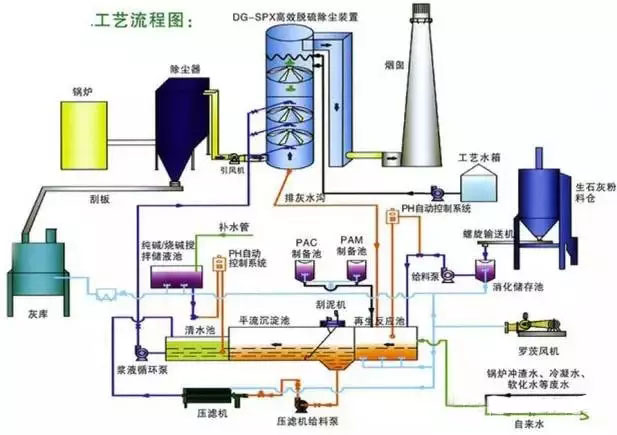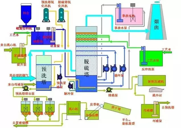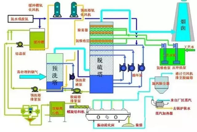 該工藝主要由脫硫洗滌系統(tǒng)、濃縮系統(tǒng)、煙氣系統(tǒng)、氨貯存系統(tǒng)、硫酸銨生產(chǎn)系統(tǒng)(若非氨-硫銨法則是于其工藝相對應的副產(chǎn)物制造系統(tǒng))、電氣自動控制系統(tǒng)等組成。